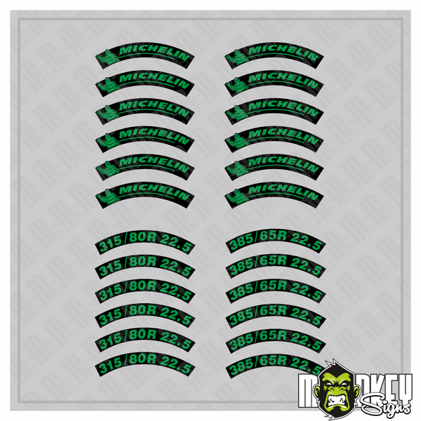 24 teiliges Set Reifenbeschriftung grün/schwarz - je 6x "315"/ 6x "385" / 12x "Michelin"
