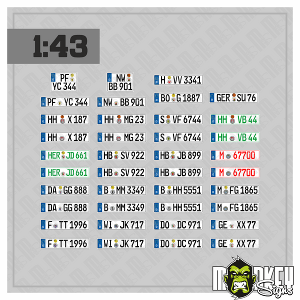 Diese Kennzeichen-Sets im Maßstab 1:43 ist die perfekte Ergänzung für deine Modellautos, Dioramen und Sammlerstücke. Enthalten sind 18 Paare gestaltete Nummernschilder plus 3 einzelne Trailerschilder, die deinem Modell einen authentischen und detailgetreuen Look verleihen.